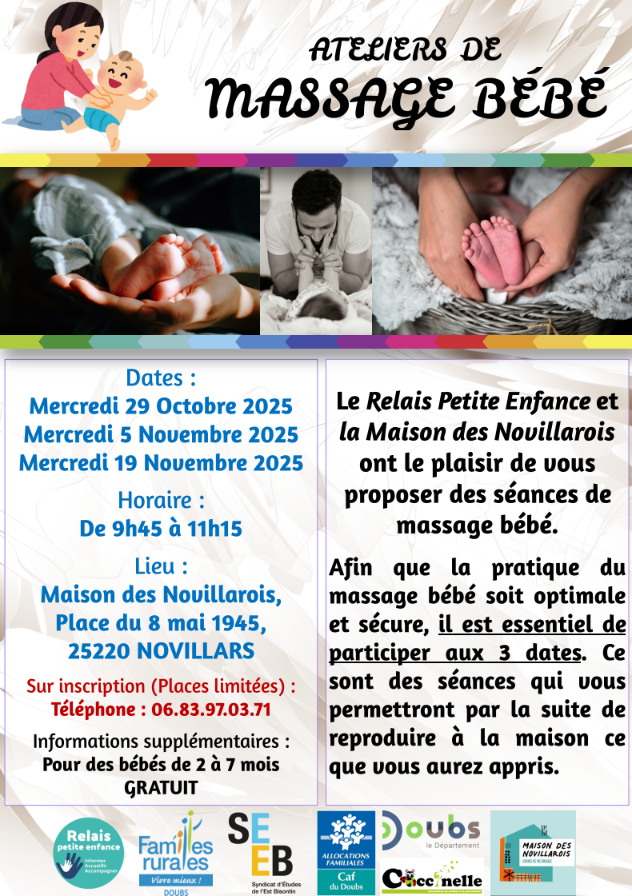 ATELIERS DE MASSAGE BEBE MERCREDI 29 OCTOBRE, 5 ET 19 NOVEMBRE DE 9H45 A 11H15 A LA MAISON DES NOVILLAROIS PLACE DU 8 MAI 1945.