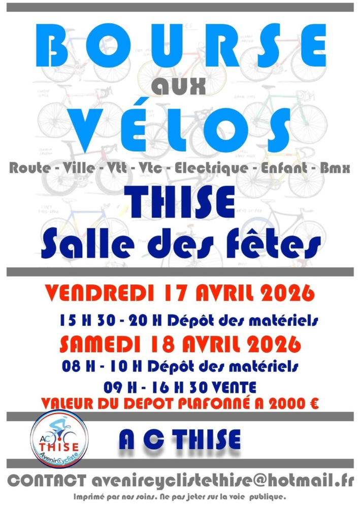 BOURSE AUX VELOS : SAMEDI 18 AVRIL A THISE SALLE DES FETES – 9H -16H VENTE