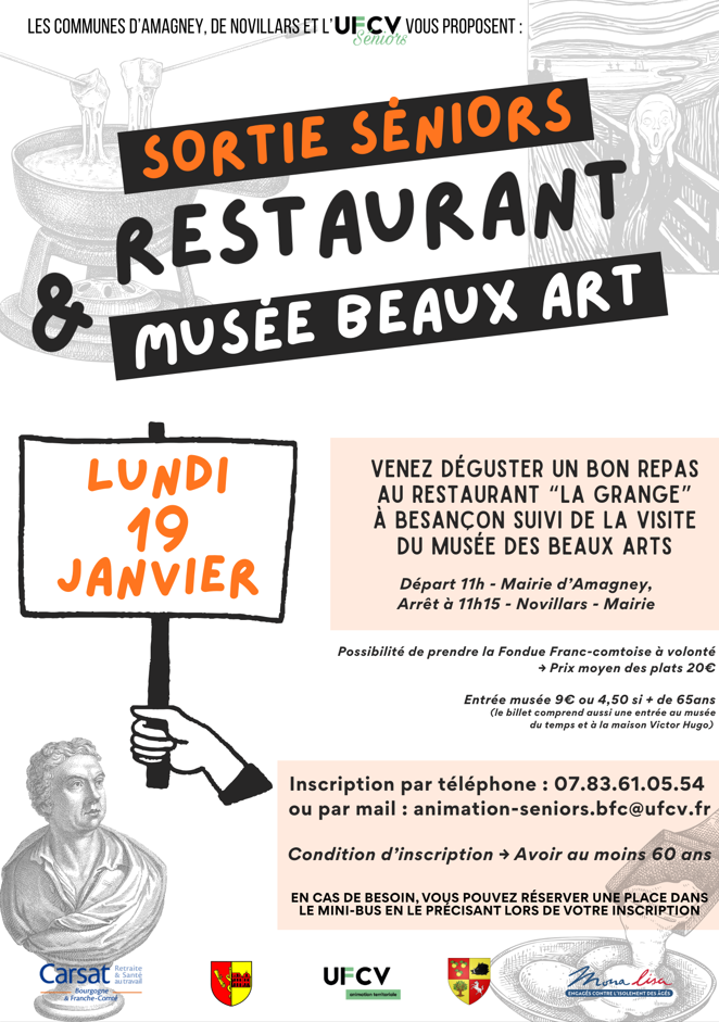 SORTIE SENIORS: RESTAURENT & MUSEE BEAUX ART – LUNDI 19 JANVIER – AVOIR AU MOINS 60 ANS. INSCRIPTION PAR TELEPHONE OU PAR MAIL